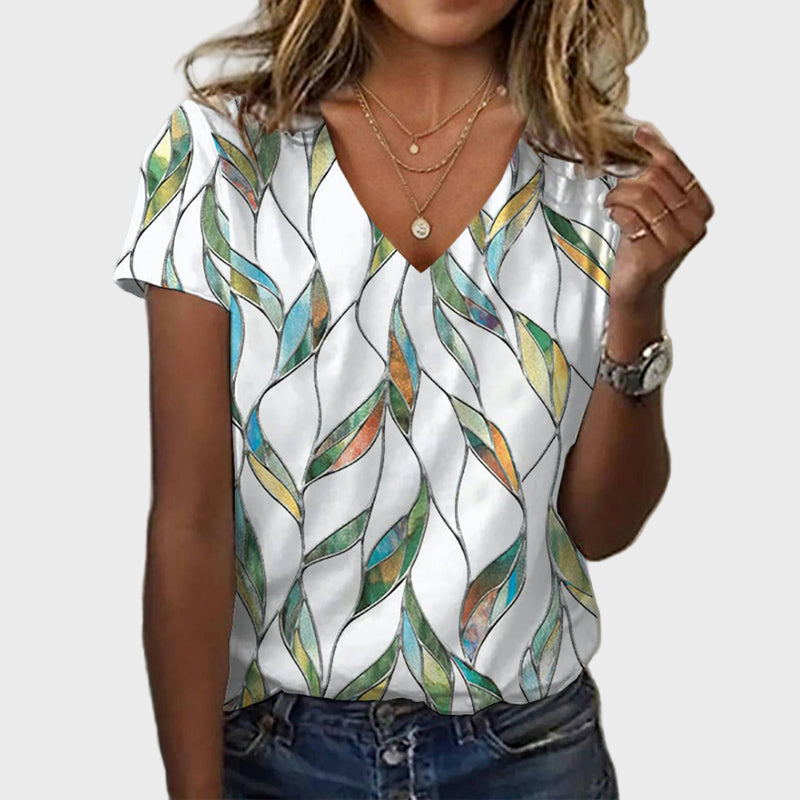 Izdignite modernu stranu svog stila s ovom bluzom na bijeloj podlozi, ukrašenom šarenim valovitim uzorcima u nijansama zelene, plave i zlatne. V-izrez dodaje ženstvenost, dok slobodan kroj pruža udobnost i eleganciju za svaku priliku.