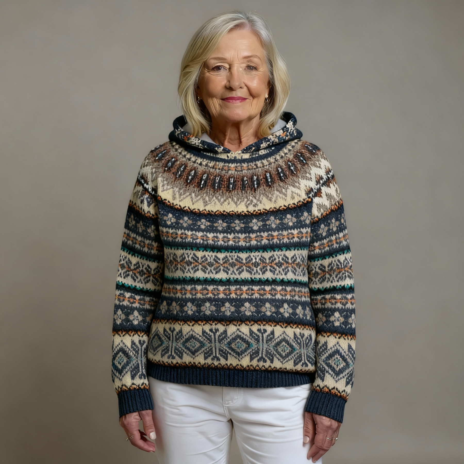 Ova pletenina ne grebe i ne iritira kožu zahvaljujući mekanoj, prozračnoj mješavini koja prija koži. Grije vas bez pregrijavanja, idealno za promjenjivo jesensko vrijeme. Materijal zadržava oblik – bez rastezanja ili opuštanja nakon nekoliko nošenja. Šareni, skandinavski nadahnuti uzorak dodaje razigran, a ipak moderan dodir svakom outfitu. Uparite ga s trapericama ili kratkim hlačama za ležeran look, ili ga podignite uz suknju i čizme. Kapuljača pruža dodatnu toplinu i opuštenu atmosferu.